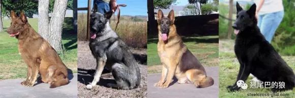 德牧的四种色型(双色、紫貂、马鞍、固体,分别对应通俗称呼:太极、狼灰、黑背、纯色)