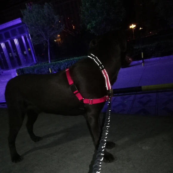 这是前扣式的,控制力还是比较强的,不是普通的胸背它如果往前冲的话,只需要轻轻拉一下,它就会被自己的冲劲带回来。